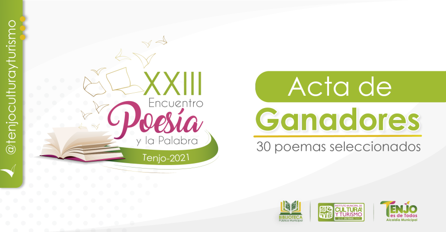 Ganadores del Concurso de Poesía y la Palabra Tenjo 2021 Escrito por admin en agosto 24, 2021. Publicado en Encuentro de Poesía y Palabra, Eventos. Deja un comentario El Instituto Municipal de Cultura y Turismo de Tenjo felicita a los Ganadores del Concurso de Poesía y la Palabra Tenjo 2021 Biblioteca, Cultural, Poesia Continuar leyendo
